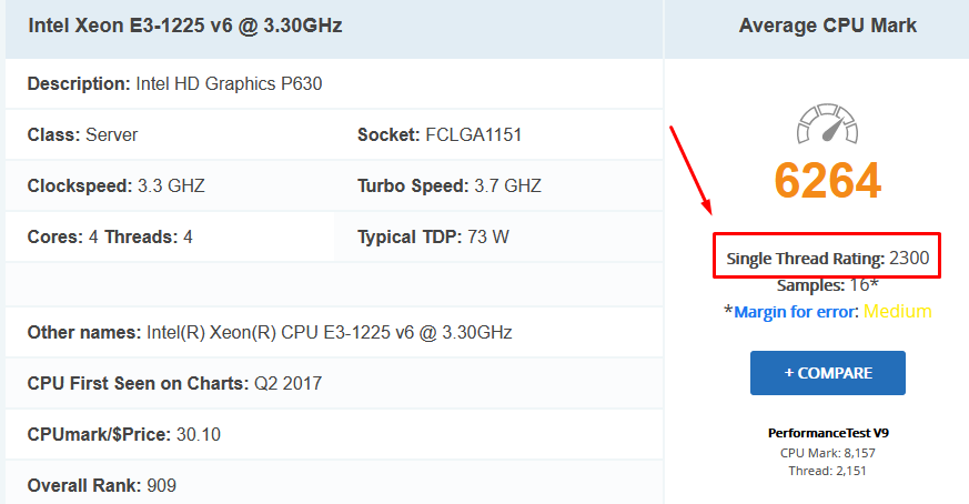 Obrázek 1. – Výkon jednoho jádra uvedený na webových stránkách: www.cpubenchmark.net
